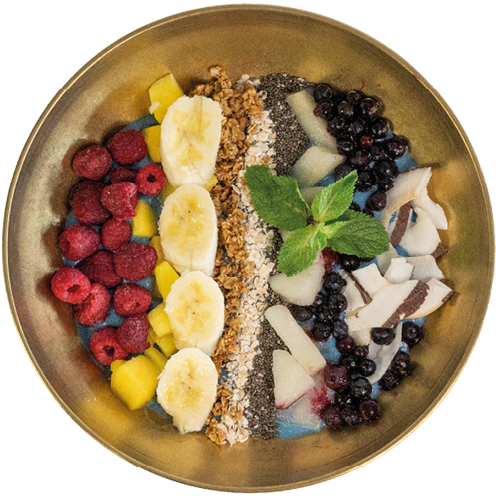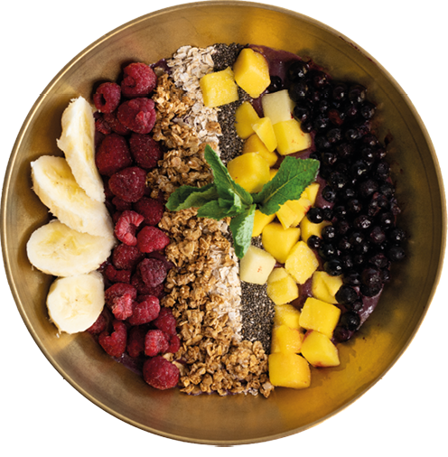 Aćai, Crunch, Haferflocken, Chiasamen, Heidelbeeren, Himbeeren, Banane, Mango