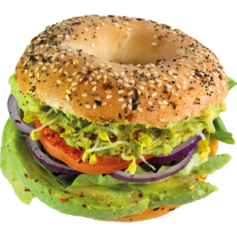 Bagel nach Wahl mit Edamame/Avocado Patty, Avocado-Creme, Avocado Spalten, rote Zwiebel, Salat, Tomate und Sprossen