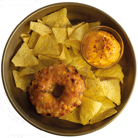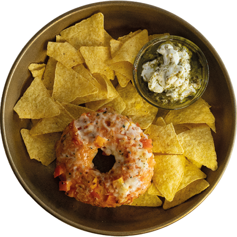 Nachos, Pizzadonut mit Frischkäse/Pesto-Füllung. Topping: Tomatensoße, Basilikum und Basilikum-Mozzarella .