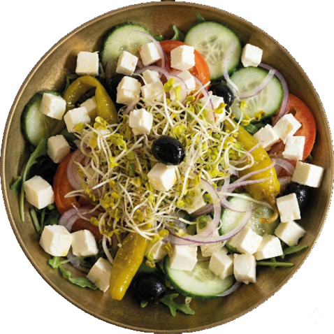 Salat, Hirtenkäse, rote Zwiebel, Gurke, Tomate, Olive, Peperoni und Sprossen