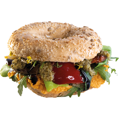 Bagel nach Wahl mit Hummus, Antipasti, Pesto, Rucola, Sprossen und Balsamico-Creme