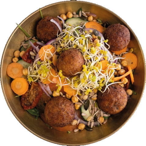 Salat, Rucola, geröstete Kichererbsen, Edamame-Falafel, rote Zwiebel, geraspelte Karotte, Tomate in Öl, Kerne-Mix