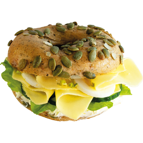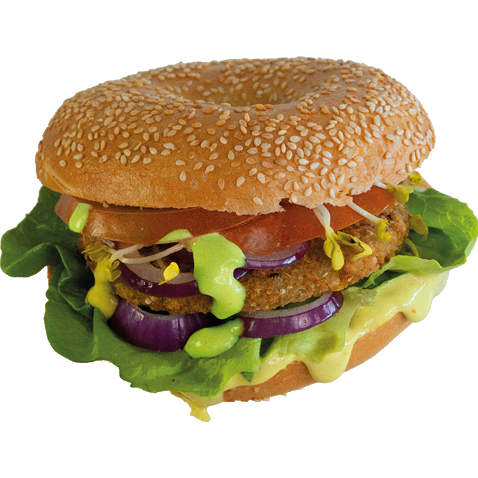 Bagel nach Wahl mit Edamame/Avocado Patty, rote Zwiebel, Tomate, Salat, Sprossen und Wasabi-Mayonnaise