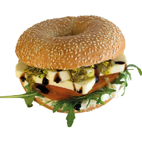 Bagel nach Wahl mit Frischkäse, Pesto Genovese, Mozzarella, Tomate, Rucola, Sprossen und Balsamico-Creme